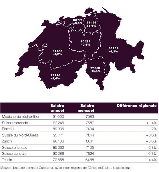 Alors qu’en Suisse le salaire annuel brut moyen s’élève à CHF 78’024.– (source : OFS, secteurs secondaires et tertiaires), l’étude de Careerplus démontre que dans le domaine de la finance et de la comptabilité le salaire brut moyen se monte à CHF 91’000.– par an pour la même période, soit 21% au-dessus de la moyenne suisse.